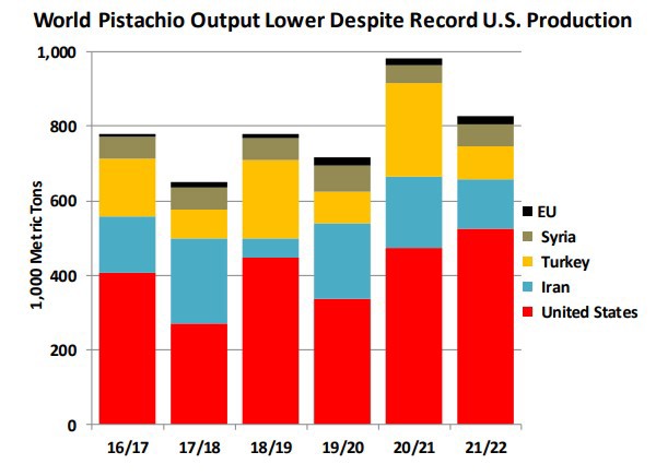 由于伊朗和土耳其的产量下降,据预计 2021/22 年全球开心果产量将下降 16% 至 829,000 公吨,这足以抵消美国产量的持续反弹。由于可供应量减少,据预计世界消费、贸易和期末库存将下降。