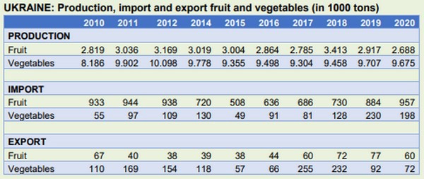就新鲜水果和蔬菜的国际贸易而言,乌克兰主要是一个进口实体。2014 年,进口有所下降,但近年来进口量再次增长至略低于 100 万吨。近年来,新鲜蔬菜的进口量明显高于以往,但由于约 20 万吨,进口量仍然不大。2020 年,乌克兰的新鲜水果和蔬菜出口量约为 6 万吨新鲜水果和 7 万吨新鲜蔬菜。