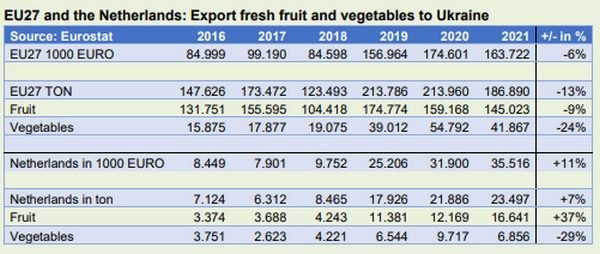 据欧盟统计局统计,2021年,190,000 吨新鲜水果和蔬菜由欧盟国家出口到乌克兰,价值 1 亿 6,500 万欧元。到目前为止,波兰是这里最重要的国家,出口量为 11 万吨,其次是希腊,为 3.1 万吨(与 2020 年相比下降 44%),荷兰为 2.4 万吨。荷兰的产品种类非常广泛。洋葱是最重要的产品,在 2021 年出口 4,000 吨。其次是鳄梨、梨、芒果、菠萝和橙子。简言之有很多转口商品。