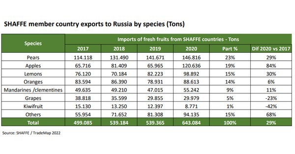 2020年SHAFFE成员国对俄罗斯出口新鲜水果643.084吨,占新鲜农产品进口市场总量的17%。同期,SHAFFE成员国向俄罗斯出口的主要水果品种包括苹果、梨、和柑橘,合计占 SHAFFE 成员国对俄出口总额的 80%。 SHAFFE成员国的新鲜农产品出口量呈上升趋势,2017年至2020年期间出口量增长达29%。南非和阿根廷是俄罗斯新鲜农产品的主要供应国,占2020年SHAFFE成员国出口总量的69%。