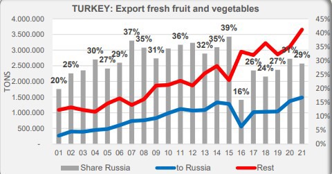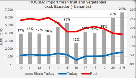 多年来,俄罗斯一直是土耳其新鲜水果和蔬菜的主要买家,俄罗斯在土耳其出口中的份额接近 30%,反之亦然,土耳其在俄罗斯进口中的份额(不包括香蕉)也接近 30%。