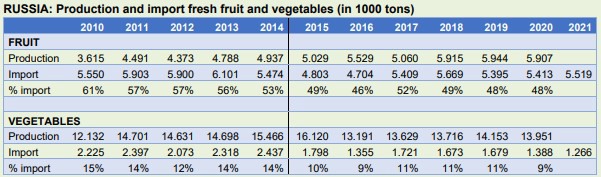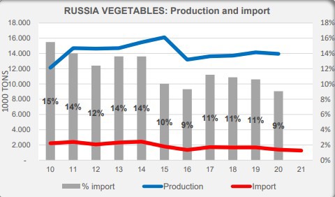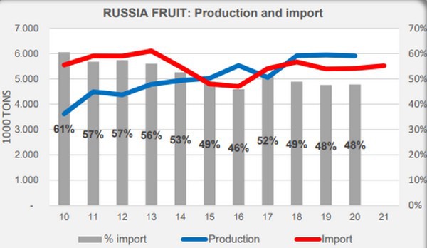 在 2014 年 8 月实施“大规模”抵制后,新鲜水果和蔬菜(不包括香蕉)的进口量从 710 万吨降至 530 万吨到580 万吨,但数量保持相当稳定。因此,俄罗斯目前没有成功地实现新鲜水果和蔬菜的自给自足。粮农组织的生产证实了这一点。多年来,俄罗斯蔬菜产量一直在 1,400 万吨左右波动。水果的产量确实上升了,但这是有限的;从 500 万吨到600 万吨。自 2014 年抵制以来,生产与进口之间的比例并未真正改变。近年来,水果和蔬菜的产量和进口量一直保持在 52% 和 48% 左右,90% 的产量和 10% 的进口量。