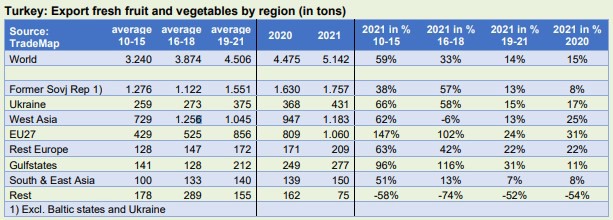 在 2021 年,土耳其新鲜水果和蔬菜的出口继续增长。去年,土耳其首次出口 超过 500 万吨(514万吨),甚至比前年 448 万吨的历史记录高出15%。