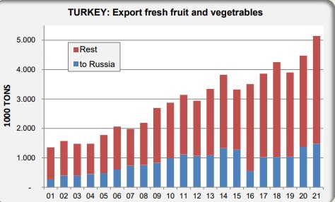 去年,土耳其向俄罗斯出口了近 150 万种新鲜水果和蔬菜。那是一个记录。甚至比 2014 年部分抵制前的出口高峰期还要多,当时的出口量达到133万吨。在2020 年,这一数字也超过了138万吨。