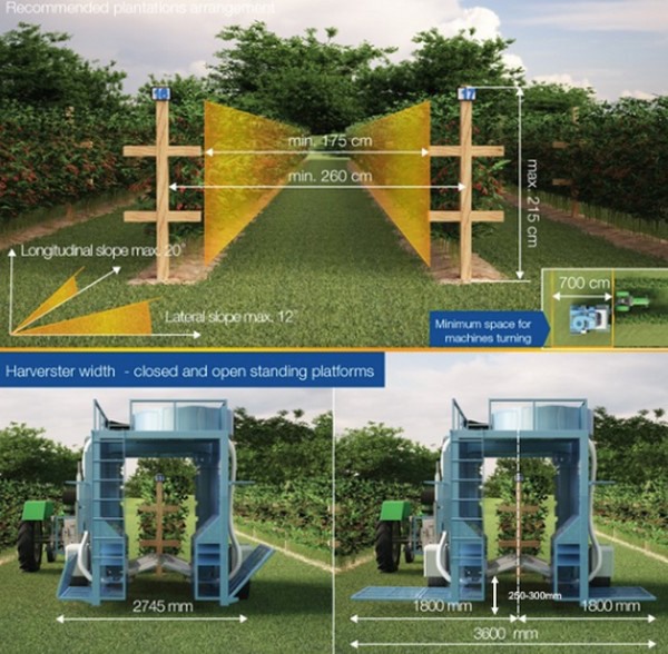 该机器上还可以安装光照灯,以便收割机可以在夜间温度下降时运行。传统上,蓝莓树种植很紧密以适用手工收获,有些种植地块可能需要稍作调整才能适应收割机工作,因为该机器需要7米的转弯岬角,但一行尾端所有需要被拔出的蓝莓树都可以重新补种在为了方便手工采摘时收集装满的托盘而留空的位置。