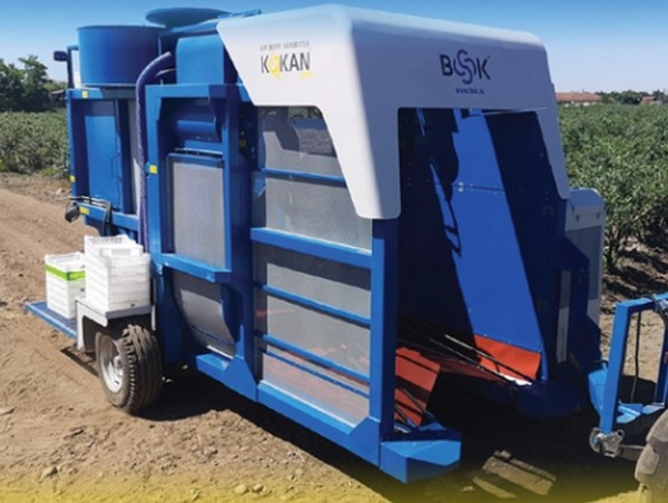 该机器使用空气速度和脉动的组合来收获浆果,可以通过设置以适应水果的多样性和成熟度,以便只有成熟的浆果才会落到收获盘上的充气枕头上。