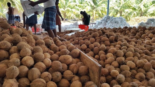 收获后,所有椰子首先要去壳。 然后按重量分级、装袋、贴标签。 熏蒸是按照 UKL 和欧洲要求进行的。 虽然椰子产季是全年的,但有淡旺季之分。在旺季,树上熟的椰子更多,规格也更好。 在淡季,成熟度较低,规格较小。 印度是全球第三大椰子生产国。 旺季从四月持续到九月。