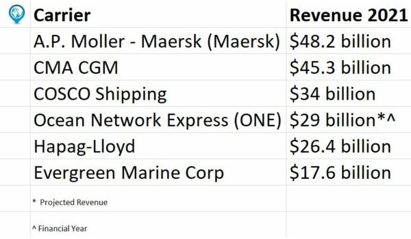 ONE (Ocean Network Express)是唯一一个尚未发布2021财年结果的海运公司。其最近的2021年第三季度报告显示,2021财年收入预计会达到290亿美元。