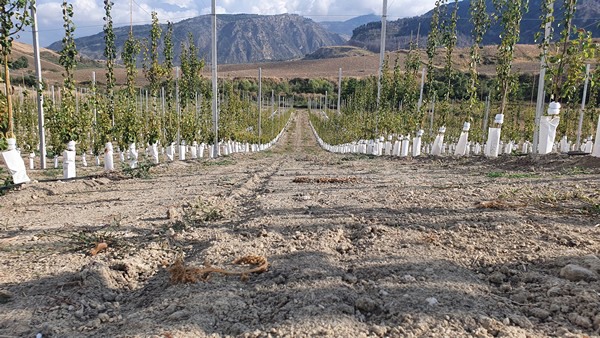 这种创新的超精细种植方法包含了3-4根铁丝,铁丝平行贯穿果园,并保持0.80米的间距。铁丝由的4米高的混凝土材质杆子支撑,杆子质检间距为10-12米。距离果树30-40cm的地方,还有分布了果园滴灌系统。