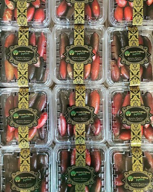 “我们的主要品种Champagne Red,已经销售到澳洲各大市场,” King女士说。 “我们也向国际市场出口,但出口量被疫情影响,有所降低。但新加坡对我们来说仍然是一个强大的市场。我们也供应当地餐馆,并直接向 IGA 等厨师和独立超市供货。Champagne Red 最具吸引力的是颜色,颜色从香槟色到红色都有。而且Champagne Red果皮坚硬,货架期长,在冰箱内可保存4-6周。 Chartreuse 是绿皮品种,有种子,但货架期更短,味道类似于'lime fizzwizz'(糖果),里面是一颗透明的颗粒。Emerald 是深色果皮,里面有绿色的颗粒。”