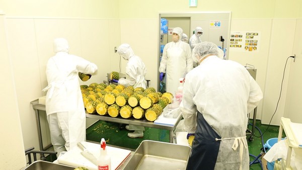 Sakamoto先生随后分享了菠萝去皮的一般程序,“一名工人首先将菠萝浸入装有消毒剂的水槽中,然后将水果的顶部和底部切掉并放入削皮机中。去皮过程结束后,第二名工人将从机器中取出去皮的菠萝,并在必要时用手修剪剩余的孔眼。之后,第三名工人将水果打包运输。出于卫生考虑,每项活动都由不同的工人执行。第一个工人触摸果皮,第二个工人只处理水果肉”,Sakamoto先生说,“使用削皮机的加工能力更高,我们可以实现简化操作,从而提高我们的生产力和效率。”