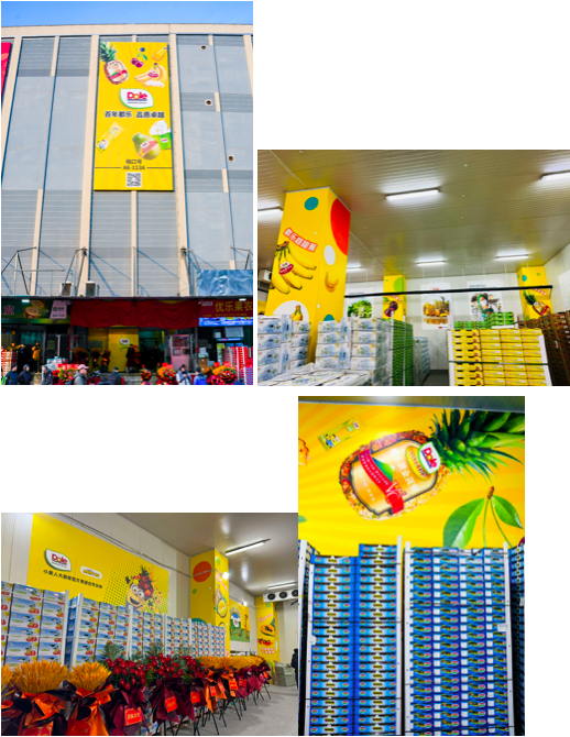 都乐阳光果蔬高碑店批发档口位于河北首衡新发地农副产品交易中心A6-113A。档口面积接近300㎡,是都乐截止目前在中国的第二家自营档口。新店设计独具一格,传递着满满的DOLE SUNSHINE FOR ALL企业文化。店铺整体以阳光温暖的黄色色调为主,店内墙体以都乐各大明星产品图做点缀;入店左手墙体还展示了都乐自1851年以来170多年的悠久品牌历史。店铺外店招则是以“百年都乐,品质卓越”的品牌slogan彰显都乐水果行业的领导地位。