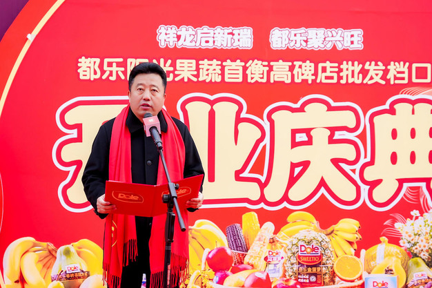 作为东道主的河北首衡集团董事长米亚林先生在致辞中肯定了都乐在中国生鲜果蔬行业的领导地位,同时表达了对都乐新批发档口的祝贺和美好祝愿,“祝愿都乐阳光果蔬首衡高碑店批发档口兴旺发达,业绩蒸蒸日上!”
