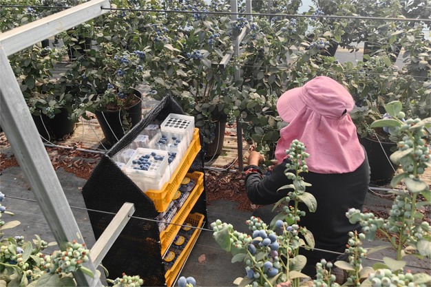 满时蓝莓主营“珠宝”品种,据Mark介绍,该品牌所产“珠宝”具有上市早及糖度更高等优势。“经过精细化管理,相比大多数种植户,我们的“珠宝”可早上市一个月,现已进行了几轮采收。头茬以20mm+, 22mm+的大果居多,之后将以中大果为主。常规“珠宝”因口感较酸,种植数正在减少,但我们改良水肥比例后,果子的酸甜比更为合理,口感更合适。”
