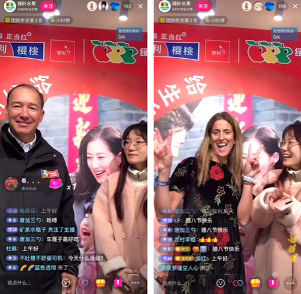 1月18日,代表团来到华中地区中心城市之一长沙。智利水果出口商协会会长Iván Marambio与樱桃委员会执行总监Claudia Soler作为神秘嘉宾,闪现绿叶水果直播间,为智利车厘子带货。随后两位嘉宾化身饿了么外卖员,背上外卖箱,把新鲜的车厘子直接送到幸运粉丝家中。