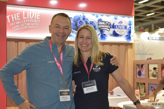 Hans Liekens 和 Anja Grueterich 在 Fruit Logistica 上的 Sekoya 展位上