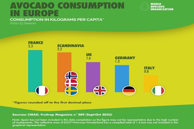 斯堪的纳维亚人平均每人消耗 2.2 公斤。相比之下,英国人平均消费 1.6 公斤,德国人平均消费 1.3 公斤,意大利人平均消费 0.8 公斤。与去年相比,法国、英国和意大利的牛油果产消费量略有增加,而德国今年继续持续增加对牛油果的消费量。