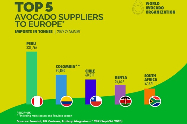 尽管墨西哥是全球最大的牛油果出口国,但只有不到 5% 的牛油果销往欧洲,而 90% 的牛油果销往美国。在欧洲,其他国家满足了人们对这种多功能且营养丰富的水果的需求。秘鲁是欧洲最大的牛油果供应国,2022/23 年度秘鲁牛油果供应量高达 331,767 吨(相比之下,来自墨西哥的牛油果仅有 38,000 吨)。哥伦比亚以 90,880 吨位居第二,其次是智利(60,011 吨)、肯尼亚(58,657 吨)和位居第五的南非(57,671 吨)。