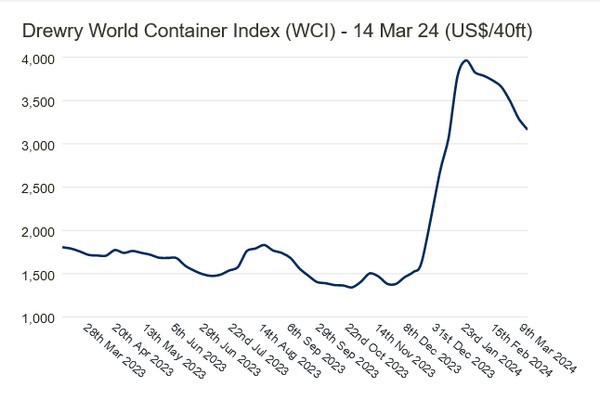 今年迄今为止的平均综合指数为每 40 英尺集装箱 3,493 美元,比 10 年平均费率 2,699 美元高出 794 美元(该平均费率因 2020-22 年特殊时期的新冠疫情而膨胀)。