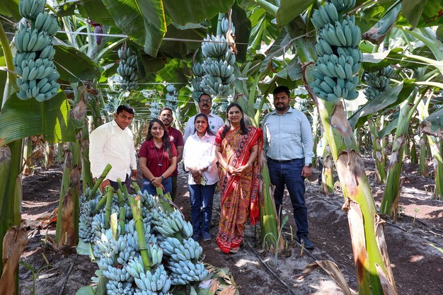 Rise n' Shine Biotech Private Limited 开发了一种名为 Blue Java 的外来组织培养香蕉品种,这种香蕉品种具有独特的味道和颜色。这是该品种首次在印度商业化推出,首次收获于2024年4月2日在 Abhijeet Patil 的农场完成。Rise n' Shine Biotech Private Limited 的创始人兼董事总经理 Bhagyashree P. Patil 博士、农场运营经理 Amey Patil、技术经理 Anil Kadam 以及提供技术指导的香蕉营销团队见证了农场的首次收获。
