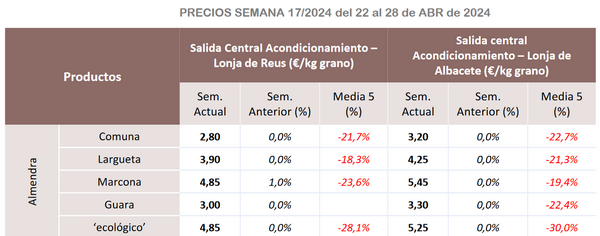 MAPA 根据雷乌斯和阿尔巴塞特市场的数据分享了 2024 年第 17 周的价格,显示所有品种的价格实际上都出现了下跌。在大多数情况下,与过去 5 年的平均水平相比,这一数字超过了 20%。有机杏仁的价格下降了 30%。