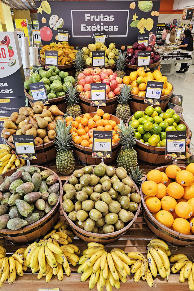利马Metro超市农产品部图片报道 在Miraflores中心,我们参观了一家Metro超市。这是一家拥有两层楼的大型商店。所有新鲜商品都在第二层。引人注目的是进口产品和本地产品之间的价格差异。 点击此处查看照片报道