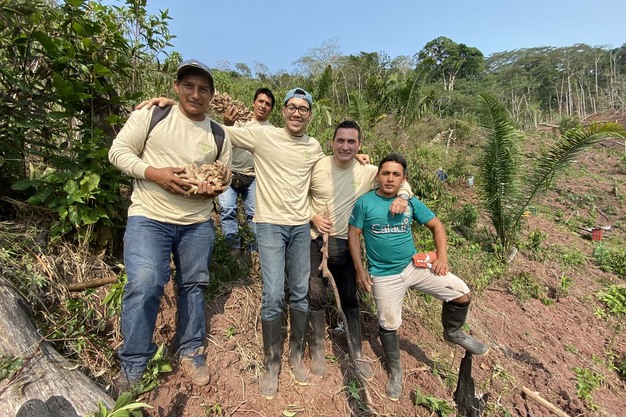 Cameron Mistal(中)与工作人员在秘鲁丛林中收获生姜。