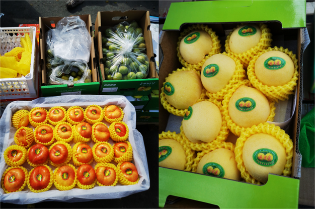 左:中国产蜂糖李和蟠桃;右:中国产黄桃