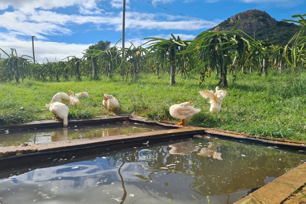 在 Kuifkop 的火龙果园里,鸭子被用来控制害虫,从而减少杀虫剂的使用。