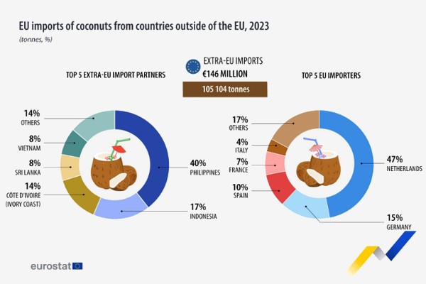 2023 年,欧盟成员国从欧盟以外国家进口椰子 105,104 吨,价值 1.46 亿欧元。其中三分之二(67%)的进口商品为脱皮椰子(70,330 吨),其余三分之一(33%)的进口商品为带壳或去皮的新鲜椰子(20,328 吨)或带内壳的 "内果皮 "椰子(14,447 吨)。