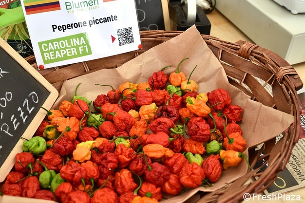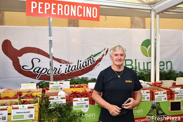 在几天前于 Rieti 举行的世界辣椒博览会上,Massimo 与 Padronetti 家族的 Si.Mar 公司合作设立了一个大型展台,并借此机会展示了多达 47 个品种的辣椒,这些辣椒来自位于 Senigallia 的Blumen 田地。