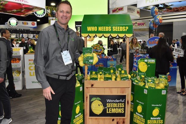 Dave Rooke 在上周于亚特兰大举行的全球农产品及花卉展上展示 Wonderful 无核柠檬。