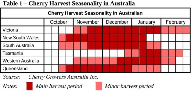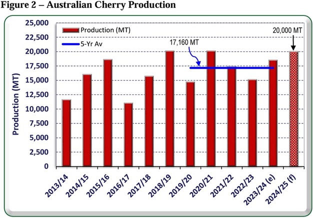 澳大利亚 2024/25 年车厘子产量预计将从 2023/24 年下调的 18,500 吨增加至 20,000 吨。这一产量预测比前五年平均水平高出 17%,比上一年高出 8%(见图 2)。尽管出现这种增长,但尽管车厘子种植面积有所增长,但预测仍然较低,与近年来过去的两次结果一致。 2024/25年度的预期增长主要是由于预期有利的生产条件。这也反映出2022/23年度收成持续反弹,收成明显低于正常水平,这是由于新南威尔士州和维多利亚州收成期间反常的潮湿条件造成的。由于同一地区收获时连续第二年出现潮湿天气,2023/24 年产量远低于预期,但影响程度较轻。