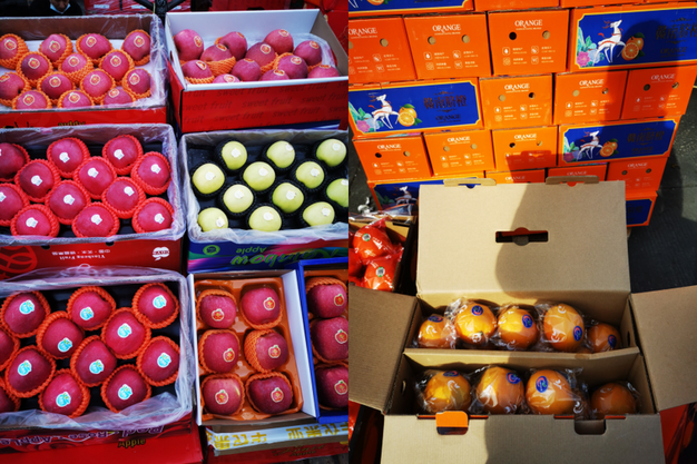 左:中国苹果礼盒装;右:赣南脐橙礼盒装