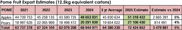 梨出口量预计将达到 2110 万当量箱,比 2024 年增长 4%。Forelle 和 Abate Fetel 的出口量预计将增长 7%,而 Packham's Triumph 预计将温和增长 2%。包括 Cheeky、Celina、Rosemarie 和 Sempre 在内的夏季梨产量预计都将比去年有所增加。早期的 Bon Chretien、Rosemarie 和 Celina 梨目前正在采收,果实质量上乘。总的来说,果实很干净,迄今为止很少发现风痕。