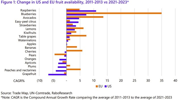 根据 Rabobank 于 2025 年 7 月发布的最新《世界水果地图》,全球新鲜水果市场正在经历结构性变化。虽然 2018 年版的许多趋势仍在延续,例如市场对蓝莓和牛油果的强劲需求,以及美国和欧洲在水果进口方面占据主导地位,但该报告概述了受气候条件、成本压力和消费者偏好变化驱动的新变化。