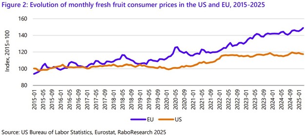 自 2020 年以来,新鲜水果的消费价格急剧上涨。截至 2025 年 1 月,欧盟的价格比五年前上涨了30%,而美国的价格上涨了 19%。虽然美国的价格在 2022 年飙升后趋于稳定,但某些加工水果,尤其是橙汁,涨幅更为迅猛。由于巴西和佛罗里达州的疾病爆发和天气干扰,冷冻浓缩橙汁期货价格从 2020 年 1 月到 2025 年 1 月上涨了 370%。