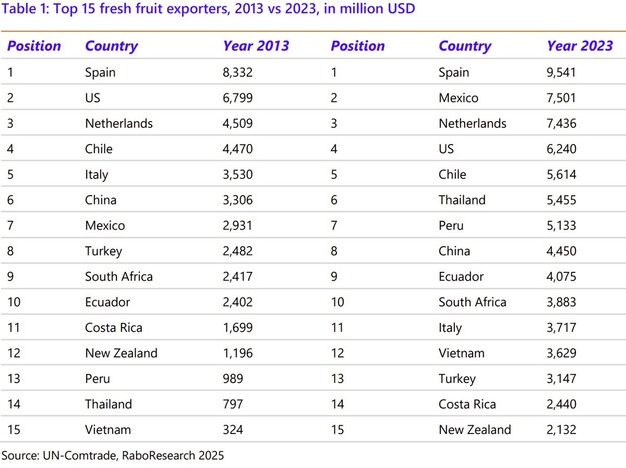 拉丁美洲继续巩固其作为主要出口国的地位。墨西哥出口额升至全球第二位,秘鲁和泰国则分别升至第七位和第六位。美国在过去十年中从第二位跌至第四位。西班牙仍然是全球最大的出口国,而荷兰则保持着其作为欧盟进口中心的地位。尽管全球水果产量以每年 1.7% 的速度增长,但欧盟和美国的国内产量却有所下降,导致进口依赖度增加,尤其是在热带水果和反季节供应方面。