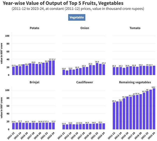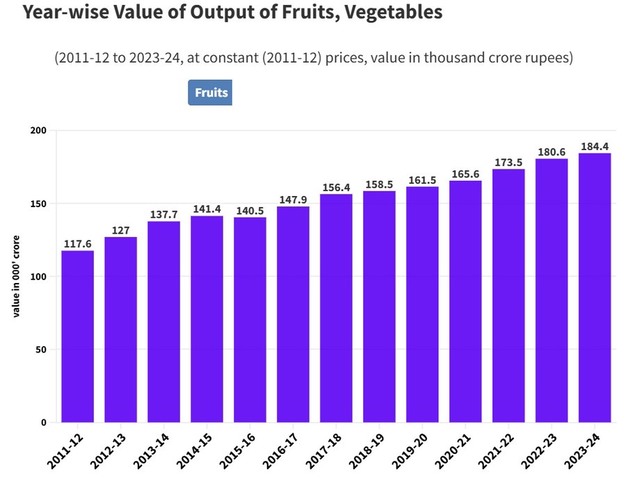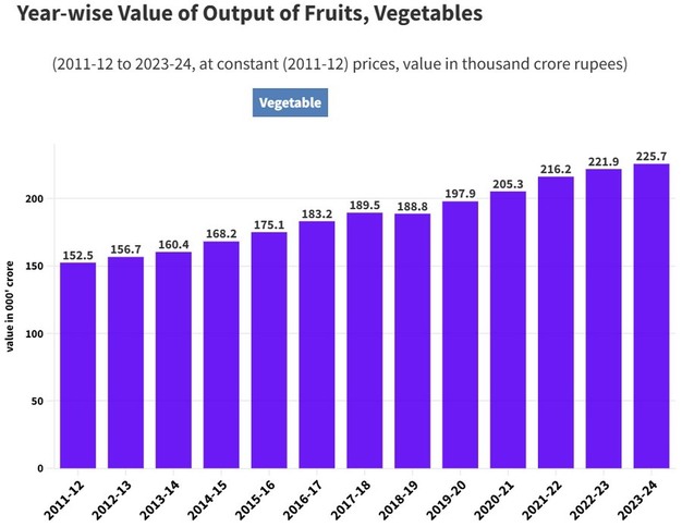 在过去 12 年中,印度农业产量持续增长,经通胀调整后,水果和蔬菜的价格大幅上涨。根据印度统计和计划实施部(MoSPI)最新发布的报告,以 2011-12 年不变价格计算,水果和蔬菜的总产值(GVO)从 2011-12 年度的 2.7 亿卢比(323 亿美元)增长到 2023-24 年度的 4.1 亿卢比(491 亿美元)。这意味着净增 1.4 亿卢比(168 亿美元),增幅达 52%。