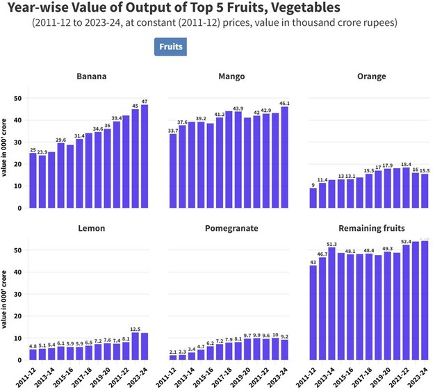 该数据由国家统计局(NSO)隶属于 MoSPI,凸显了园艺领域作物优先顺序的变化和市场需求的不断变化。芒果和香蕉一直是水果中的佼佼者,2023-24 年,它们合计占水果总产值的比重达到 50.2%。