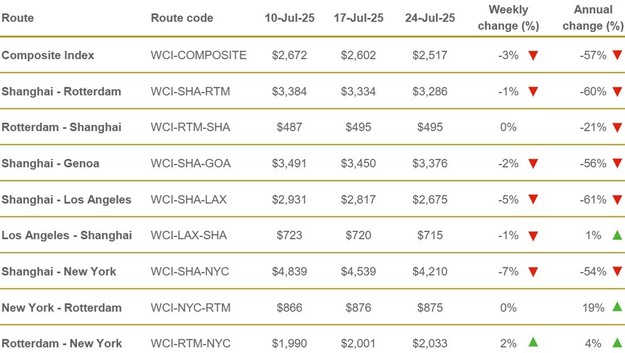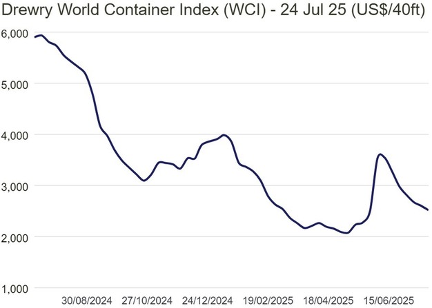 Drewry 世界集装箱指数(WCI)两周前下跌 3.3%,连续第六周下跌。在此之前,4 月份美国宣布提高关税引发了一段时间的波动。市场对关税的反应被推迟了一个月,关税率在 5 月份开始攀升,并在 6 月份的第一周猛增。然而,这一趋势后来发生逆转,自 6 月中旬以来,汇率持续下跌,表明关税的初步市场影响并未持续。