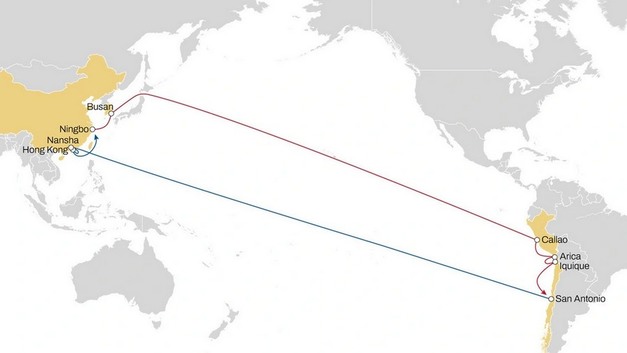 计划的轮换航线为:宁波(中国)-釜山(韩国)-Callao(秘鲁)-Arica(智利)- Iquique (智利)-圣安东尼奥(智利)-南沙(中国)-香港(中国)-宁波(中国)。