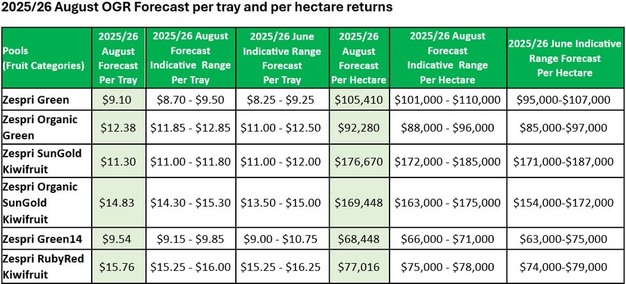 佳沛(Zespri)发布了其对 2025/26 产季的首份完整预测,该预测显示除 SunGold 和 Organic Green 外,大多数奇异果类别的单位公顷收益均创历史新高。