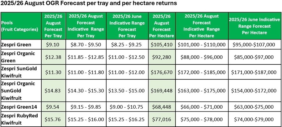 佳沛(Zespri)发布了其对 2025/26 产季的首份完整预测,该预测显示除 SunGold 和 Organic Green 外,大多数奇异果类别的单位公顷收益均创历史新高。