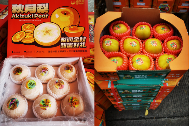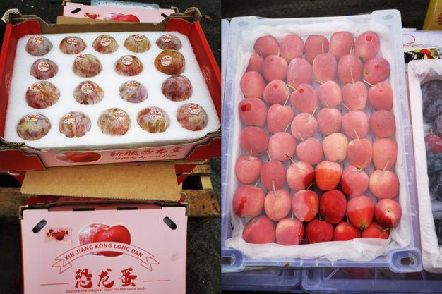 中国产水果中较受关注的品项为新疆西梅及中秋果品。本周新疆西梅尤其伽师西梅到货减少,价格比上周上涨¥5-¥10/件,销售顺畅。商户说因本季伽师西梅在花期时遇沙尘暴,产量较少。其他在售新疆水果包括海棠果、恐龙蛋、吊干杏等,其中海棠果本周到货显著增加。
