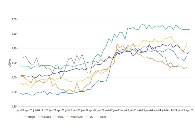 2024 年,全球马铃薯产量估计为 3.72 亿吨,其中中国和印度位居前列。Van Rijswick 表示:"虽然这些国家的份额持续扩大,但从长远来看,欧盟和美国的产量几乎没有增长。尤其是相对较高的每公顷平均单产,正面临压力。"