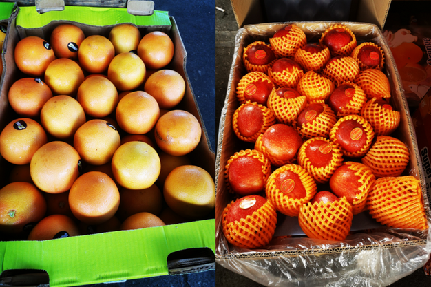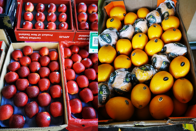 左:新西兰红玫瑰苹果;右:南非金巴利橙(Cambria)
