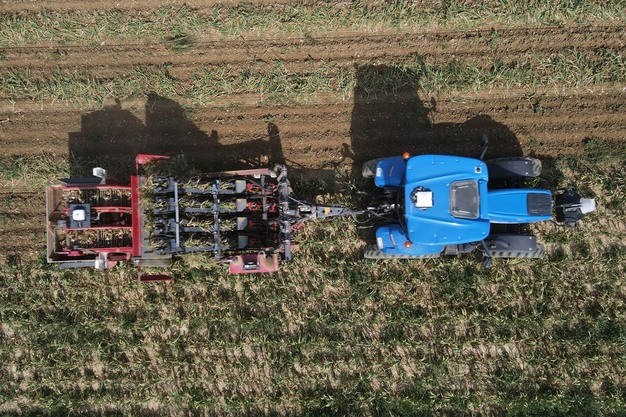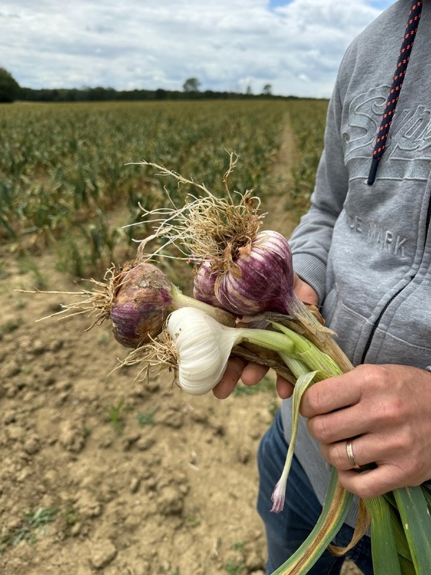Laurent Heinis 解释说,在 50-60 公顷的种植面积中,有 30 公顷种植的是 Billom 粉蒜,这是一种粉红色的春蒜(正在申请 PGI 保护地名)。这种蒜与 Arleux 烟熏蒜相同,但未经烟熏处理,Arleux 烟熏蒜的种植时间比法国大多数秋蒜晚。收获期在 7 月 14 日之后。今年,6 月底的热浪对产量造成了重大影响,因此产量不大,大部分蒜粒较小(40-60 厘米)。不过,从卫生角度来看,情况良好,几乎没有镰刀菌或枯萎病。其余种植面积主要用于秋蒜生产,旨在供应早期鲜食市场以及加工。多姆山省拥有欧洲最大的大蒜脱水厂之一。