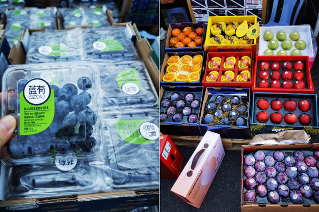 左:秘鲁蓝莓;右:各式中秋水果礼盒装