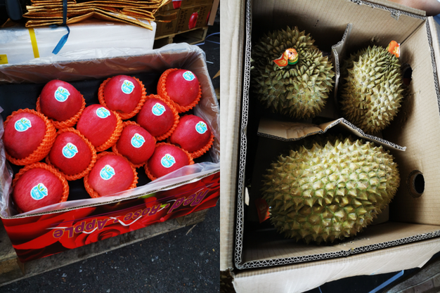 左:甘肃产红玫瑰苹果;右:越南榴莲